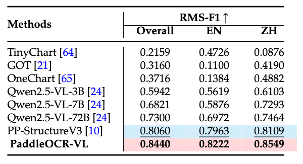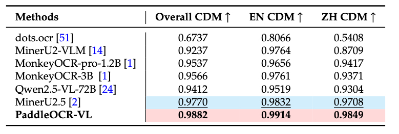 SOTA Performance on Document Parsing: PaddleOCR-VL achieves state-of-the-art performance in both page-level document parsing and element-level recognition. It significantly outperforms existing pipeline-based solutions and exhibiting strong competitiveness against leading vision-language models (VLMs) in document parsing. Moreover, it excels in recognizing complex document elements, such as text, tables, formulas, and charts, making it suitable for a wide range of challenging content types, including handwritten text and historical documents. This makes it highly versatile and suitable for a wide range of document types and scenarios.